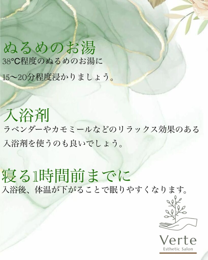 入浴は体を温めリラックス効果を高めるため、睡眠の質を向上させるのに役立ちます。