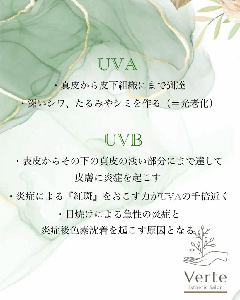 [UVB]・表皮からその下の真皮の浅い部分にまで達して皮膚に炎症を起こす・炎症による『紅斑』をおこす力がUVAの千倍近く・日焼けによる急性の炎症と炎症後色素沈着を起こす原因となる