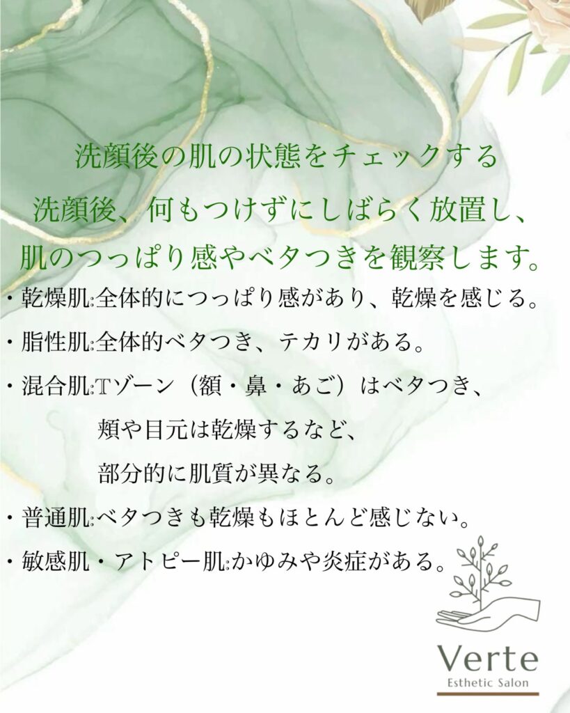・混合肌:Tゾーン(額・鼻・あご)はベタつき、頬や目元は乾燥するなど、部分的に肌質が異なる。